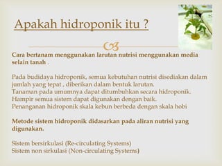 Hidroponik juga dikenal dengan sebutan soilless culture yang artinya budidaya.